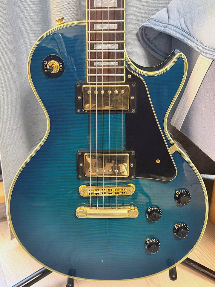 父が持っていた個体はもっと濃い、紺色・黒色に近いような青色だったのだが、この個体はもっと青色が明るい印象。直射日光などで少し退色したということなのだろうか。ほぼ20年前のギターで、多少の傷やプラスチックパーツの割れ、ゴールドパーツの色落ちなどは見受けられるが、割とキレイに保っている。