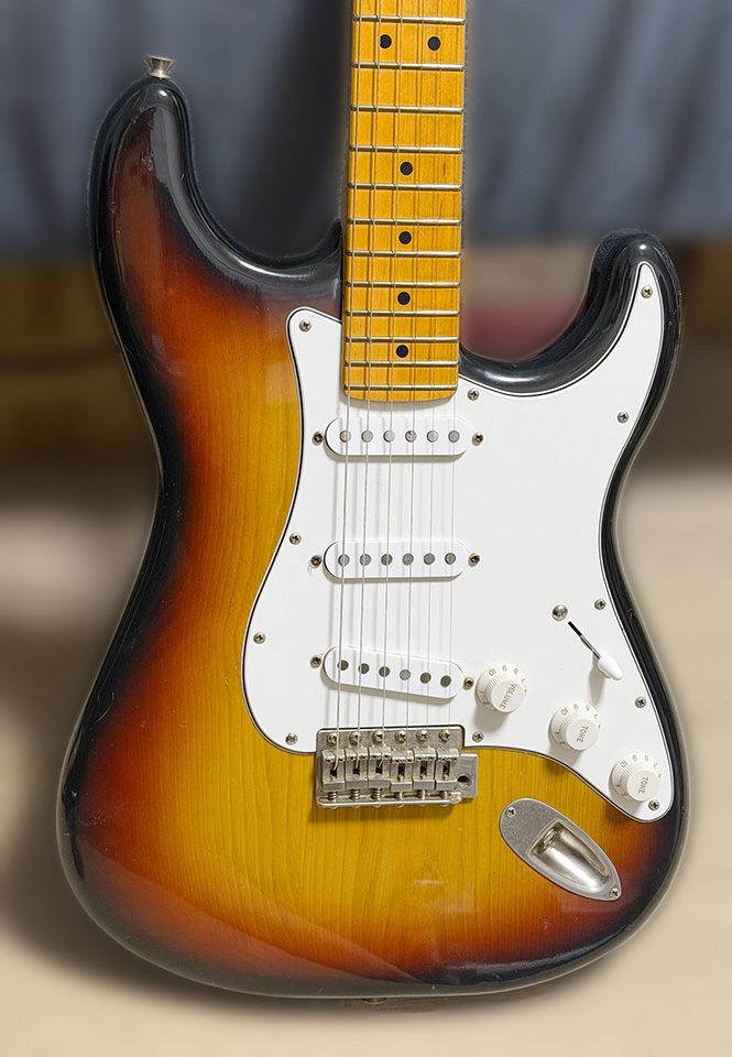 22F のメイプルネックで、ボディ材は不明だが Fender Japan ST68RH と同じくずっしりと重たいので、アルダーボディだったりするのかな。3トーンサンバーストも綺麗。