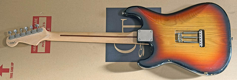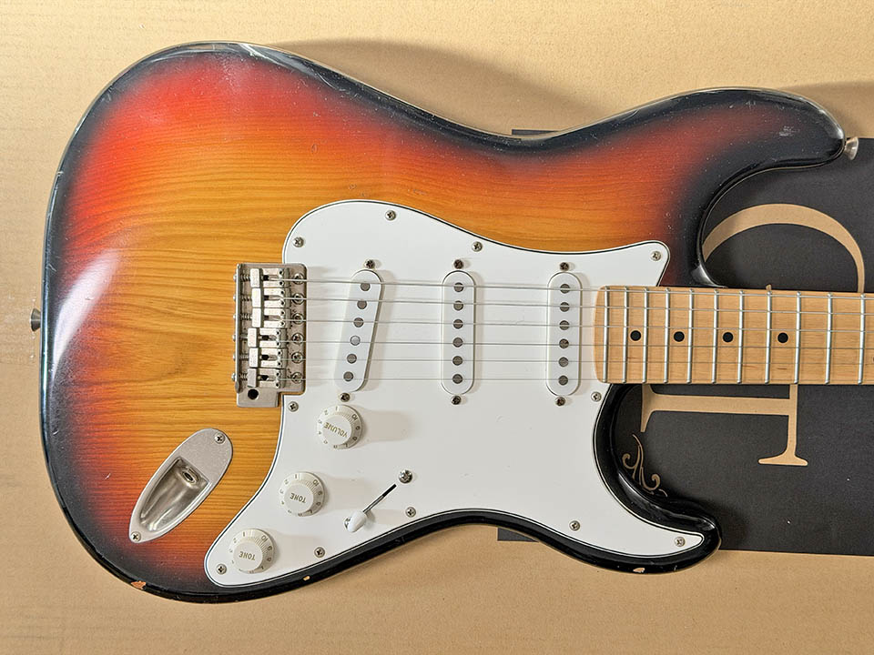 高中正義が使っているような3トーンサンバーストのストラトで、中央の黄色部分が綺麗で、赤の部分が太く目立つ配色のモノをずっと探していた。可能なら100本限定生産だった「Fender Custom Shop Takanaka Stratocaster」のような色味・スペックが欲しくて、現実的な価格帯だと Fender Japan ST58 あたりが入手性良いかなーなんて思っていたが、メーカーに拘らずジャパビンなども探していたところ、コチラに出会った。2025-12-12 ヤフオクで購入し、2025-12-14 到着。