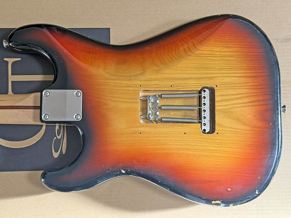 コチラは Fernandes のボディに Mighty Mite のネックというニコイチの改造品である。ボディは「石ロゴ期」と呼ばれる1977~1981年頃のモノらしい。3トーンサンバーストの色味はかなり期待していたモノに近い。赤部分が太めで、外周の黒部分が細めな感じが良い。電装系もちょっと手が入っているっぽいが、とりあえず動作不良はなく良さげ。当時のフェルナンデスはトーカイか河合楽器が製造していたらしく、品質は十分。ボディ材としては「セン (栓)」と呼ばれる、アッシュに似た特性の木材らしい (日本で採れるからジャパニーズアッシュと呼ばれることもあるそうだが、アッシュとは科も異なる木材)。