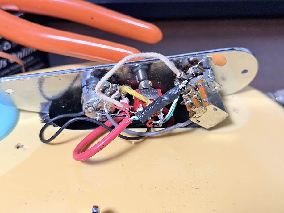2025-12-23、ミドルトーンノブでリアトーンも操作できるように配線を変更した。Dumont と書かれたデカいコンデンサが載っているのを確認。